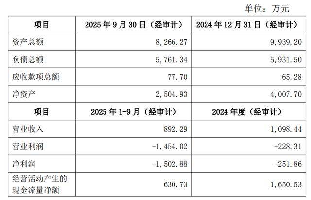 标的公司财务状况方面,公告显示,赛隆生物连续亏损。2024年度亏损251.86万元,2025年前三季度亏损幅度扩大至1,502.88万元;营收方面,2025年前三季度营收为892.29万元,2024全年为1,098.44万元。净资产方面,截至2025年9月30日,净资产2,504.93万元,2024年末净资产4,007.70万元;经营活动现金流净额方面,2025年前三季度数据为630.73万元,2024年度数据为1,650.53万元。